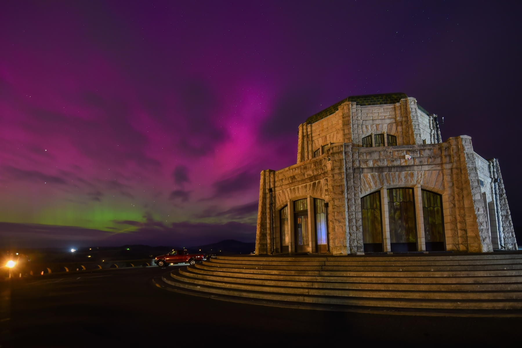 It was getting late, but given that we were finally seeing the Northern Lights in person, we wanted to take full advantage so we headed down the road a bit to Vista House. As luck would have it just as we arrived at Vista House, the auroras began intensifying. We could actually just barely see them with the naked eye. They weren’t really colorful, but it did look a bit like the first glimmers of sunlight over the horizon, extending up into the sky in long, narrow fingers. I got the camera setup right in front of the truck, looking out over the winding road descending down into the Gorge, and holy cow! Instead of an indistinct glow like I’d seen over at the Women’s Forum, now we could see waves and flares of pink light arcing up into the sky over bright green!