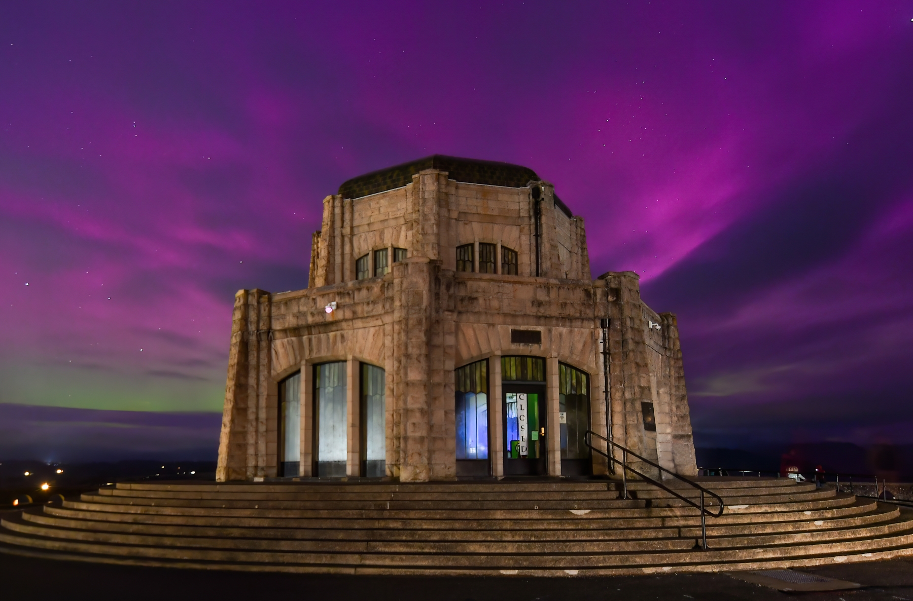 I began moving around the Vista House, taking pictures as I went. After maybe 15-20 minutes some clouds or fog began to roll in, which began reflecting the light from the auroras, and boy did that make for a dramatic shot of what my grandad used to the call “The Million Dollar Toilet” with the Northern Lights bursting out around its dome. That was a total money shot!